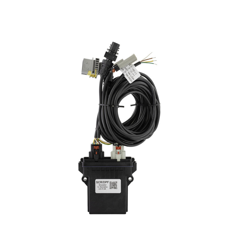 Dedicated SCR/DPF emulator for Komatsu machines – includes dummy plug for original Denoxtronic 2.2 module for full compatibility.